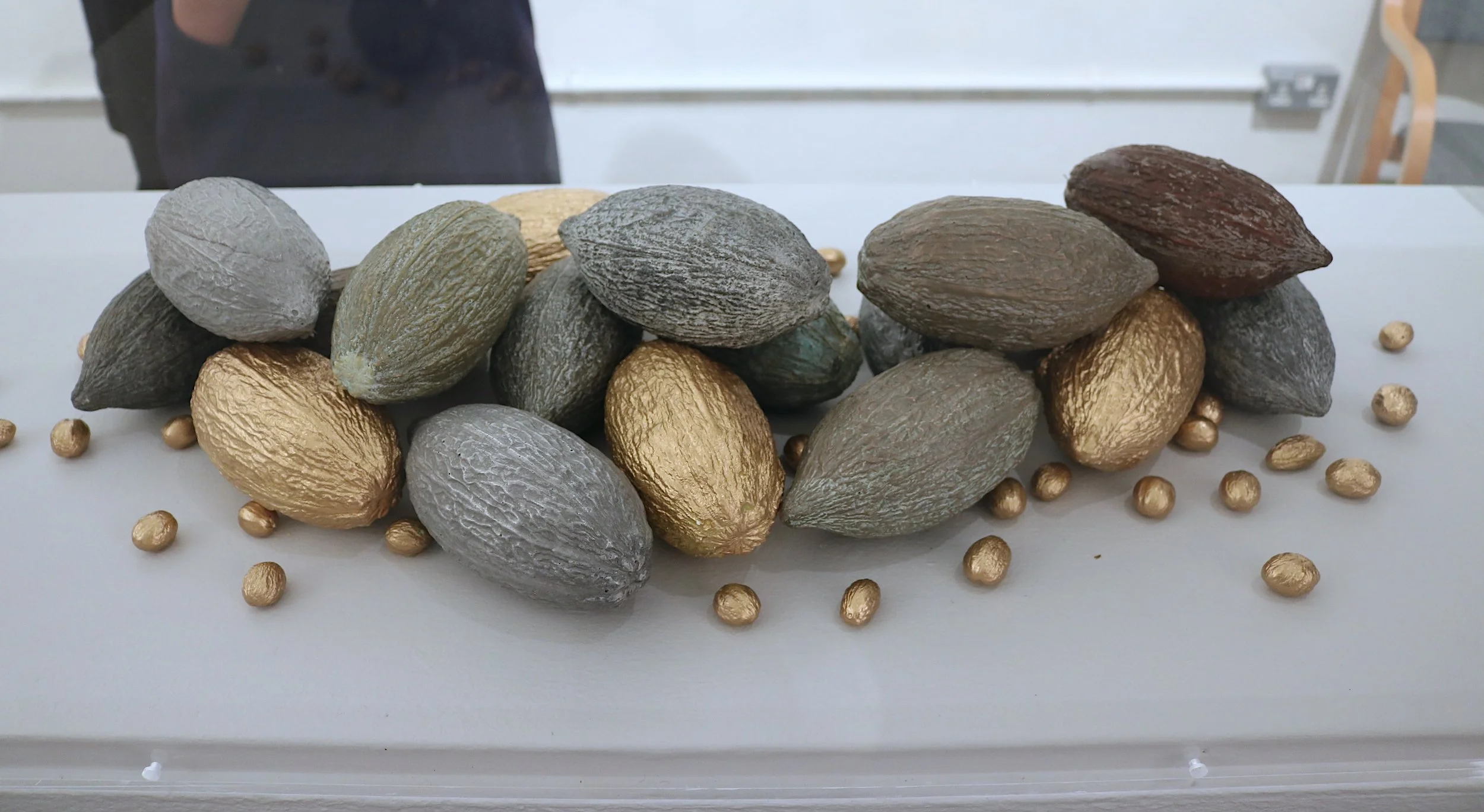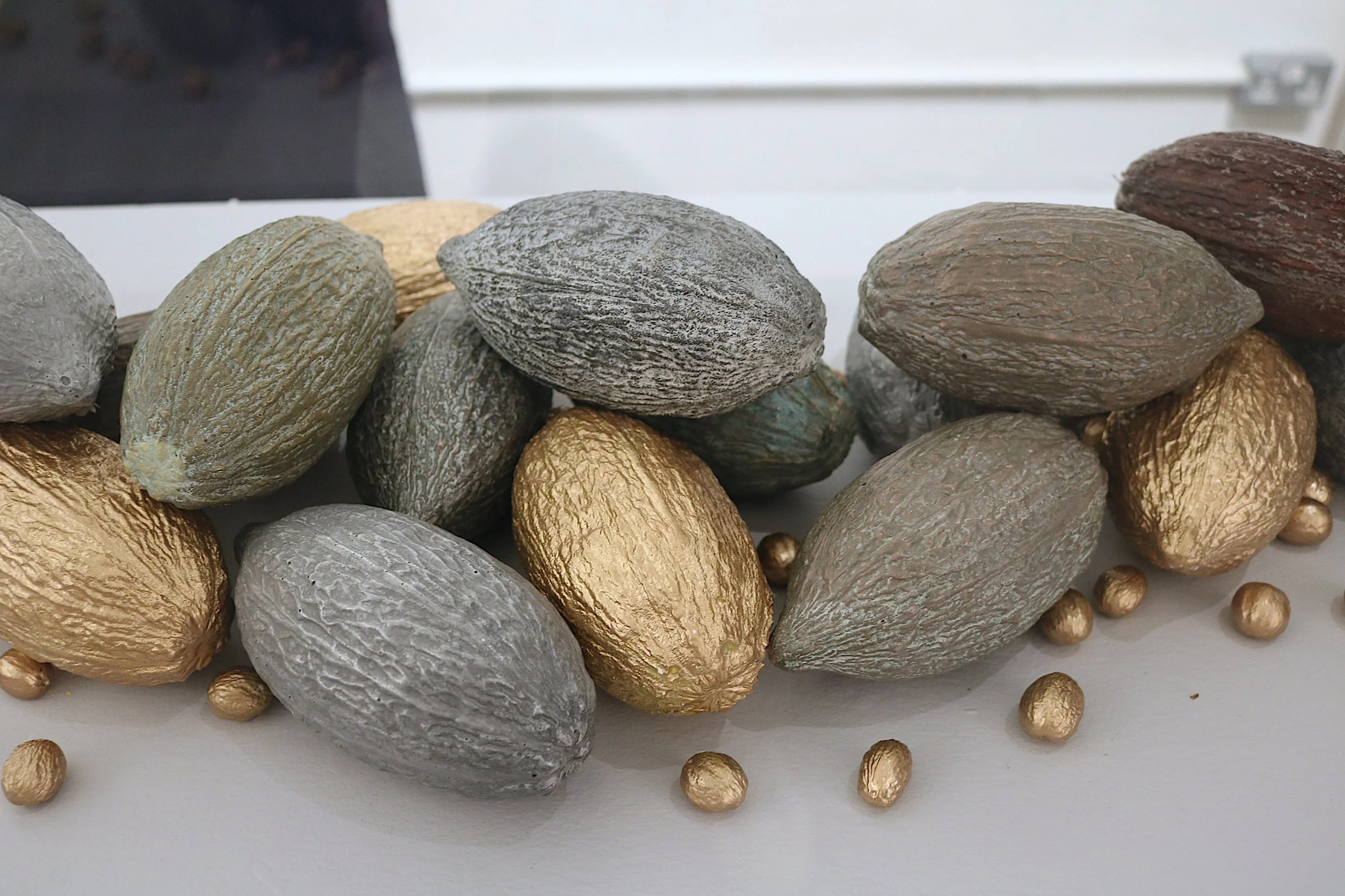 In this exhibition, I exhibited a sculptural piece entitled ‘Black Gold’ which consisted of nutmeg and cocoa pods made from cold casted metals such as bronze, Iron, brass and aluminium.